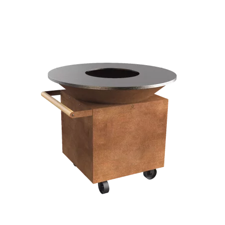Il suffisait d’y penser : une cuve conique déposée dans un pied carré évidé dans sa partie supérieure. Une plaque d’acier très épaisse permettant une bonne montée en température grâce aux bûches en flamme dans la cuve. Après 20 minutes, les bûches pourront être réparties sous le pourtour de la plaque afin de générer des zones de températures différentes selon vos attentes.