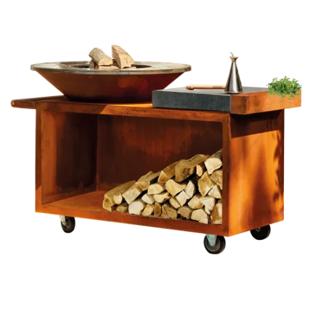 Constitué d’acier corten , il comprend un brasero OFYR black 100 pro (place de 100cm de diamètre) ainsi qu’un grand compartiment pour stocker le bois. Le OFYR Island black pro est une véritable cuisine extérieure qui vous offre un large plan de travail en céramique pour y poser votre planche à découper ou vos plats.